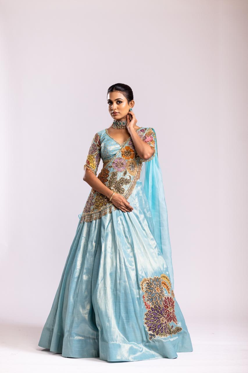 Our embroidered dupatta adds a delicate elegance to Our lehenga set and blouse, intricately embroidered in peeta and metallic sequins.