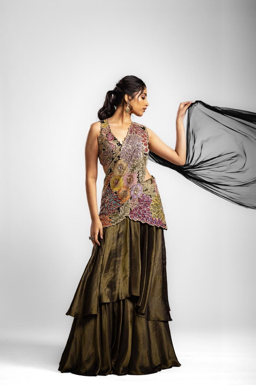 Our embroidered dupatta adds a delicate elegance to Our lehenga set and blouse, intricately embroidered in peeta and metallic sequins.