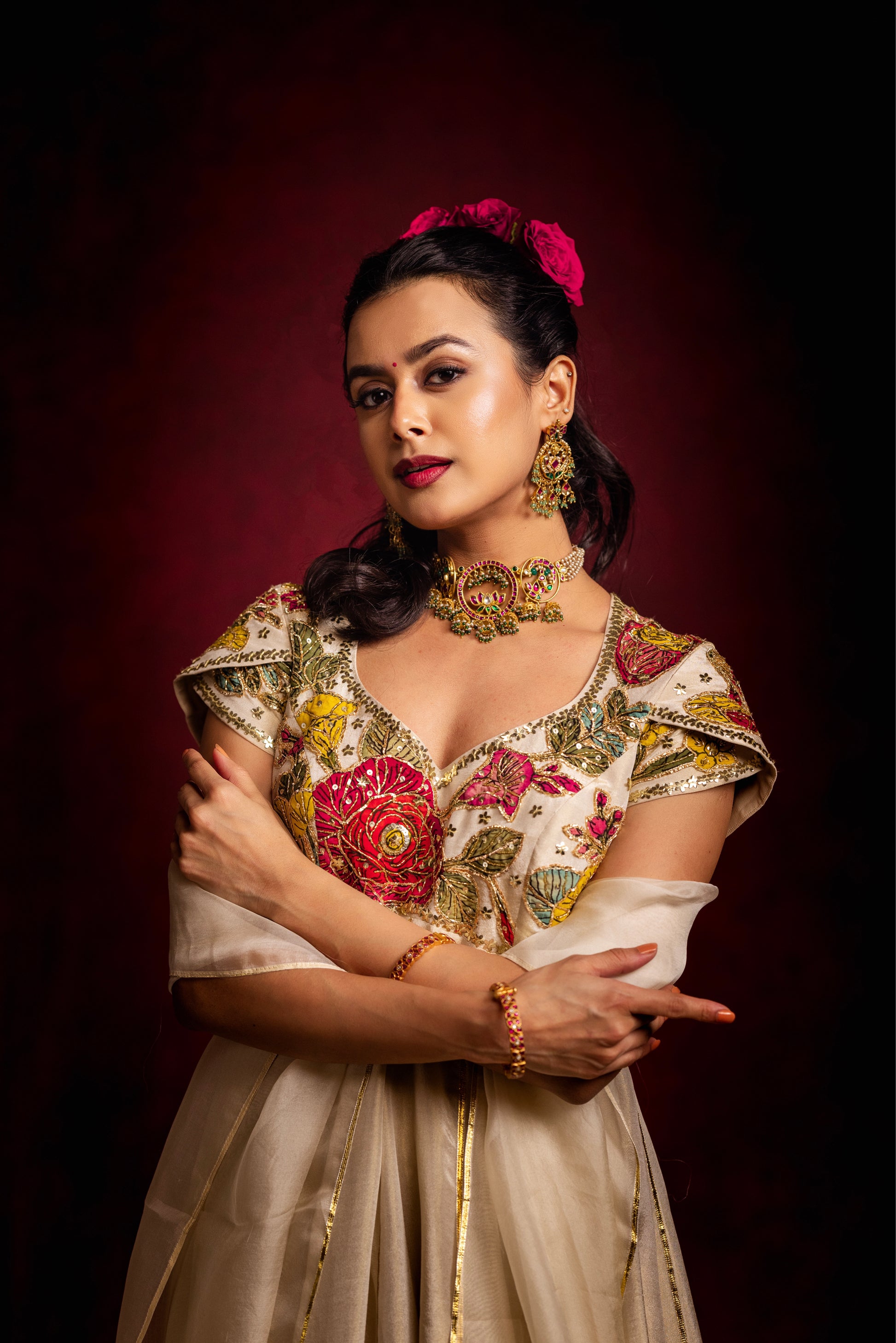 Anarkhali set stitched to perfection with the perfect balance of golds and vibrant florals paired with silk pants and a delicate dupatta